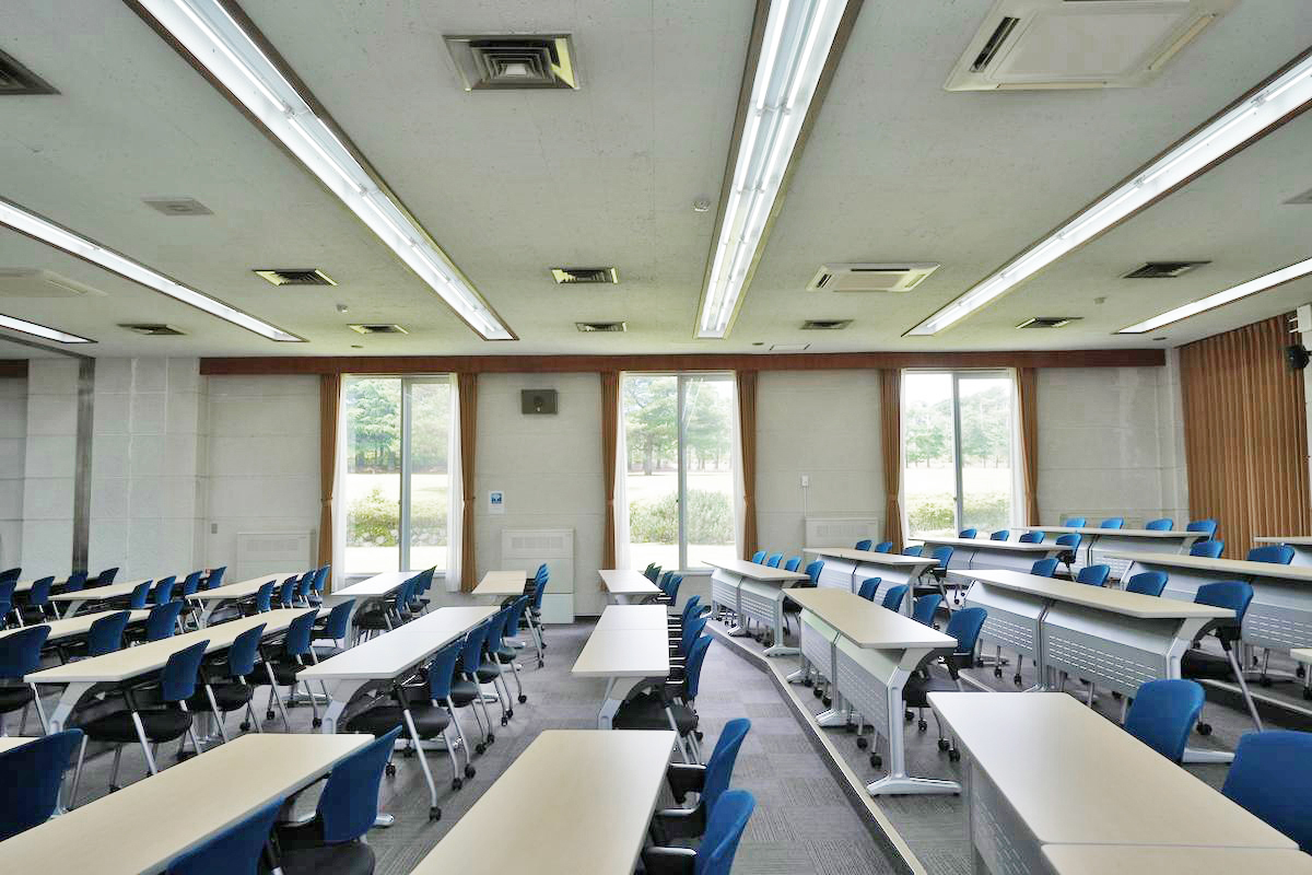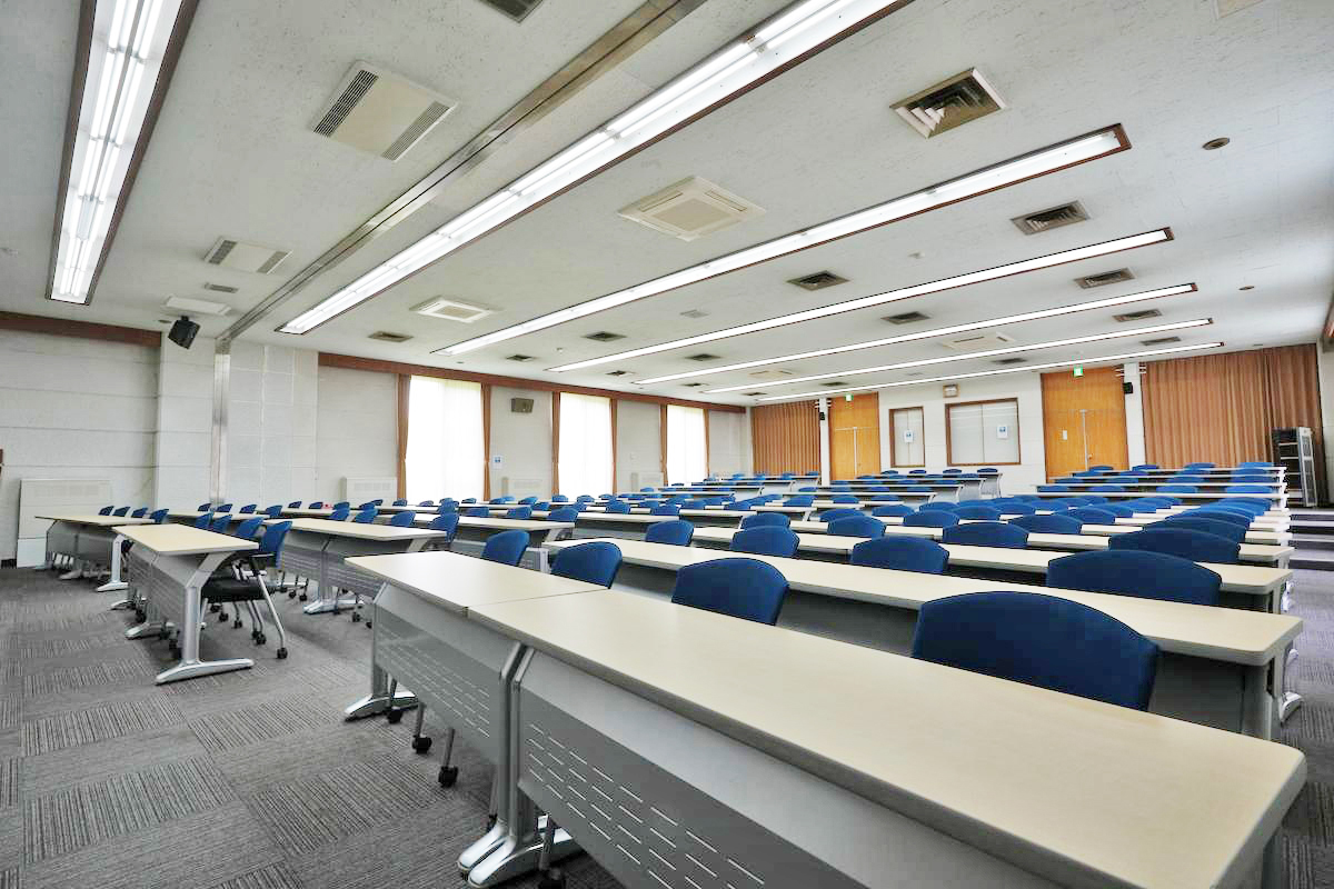 大研修室専用のwi-fiと有線LANあり、机は2名掛け机(長1.5m×幅0.45m)です。レイアウトは自由に変更できますが、後ろ4列は階段になっているためスクール形式固定です。基本人数は目安ですので、実際のご利用人数はご相談ください。