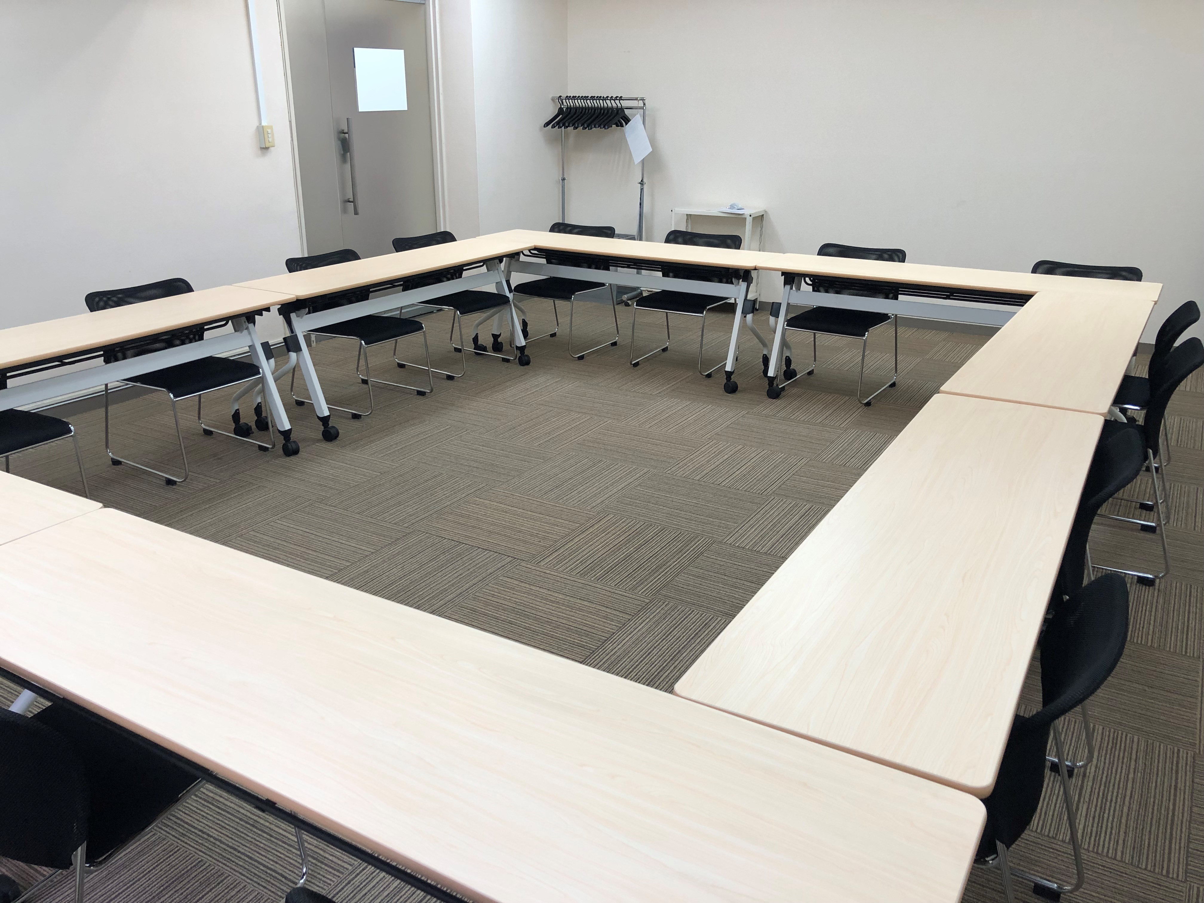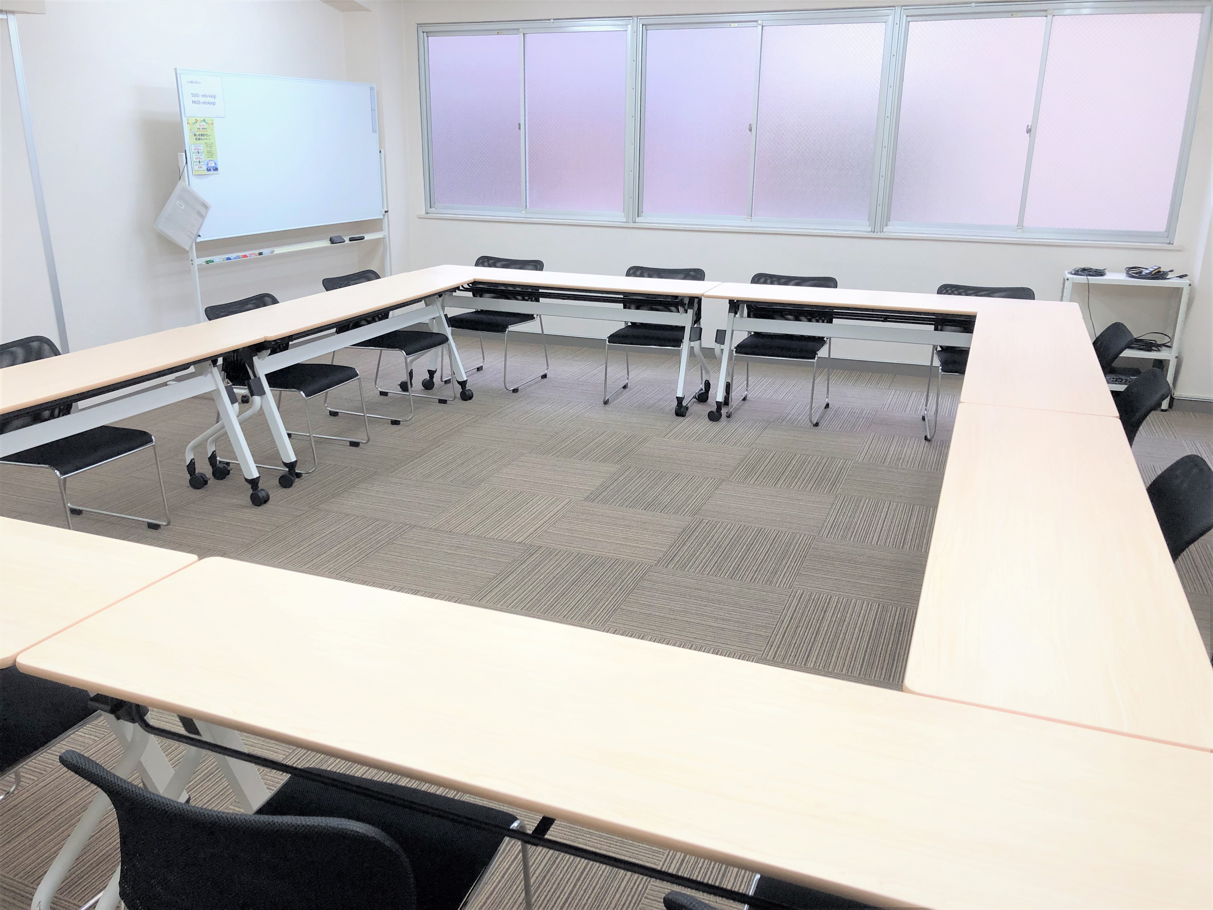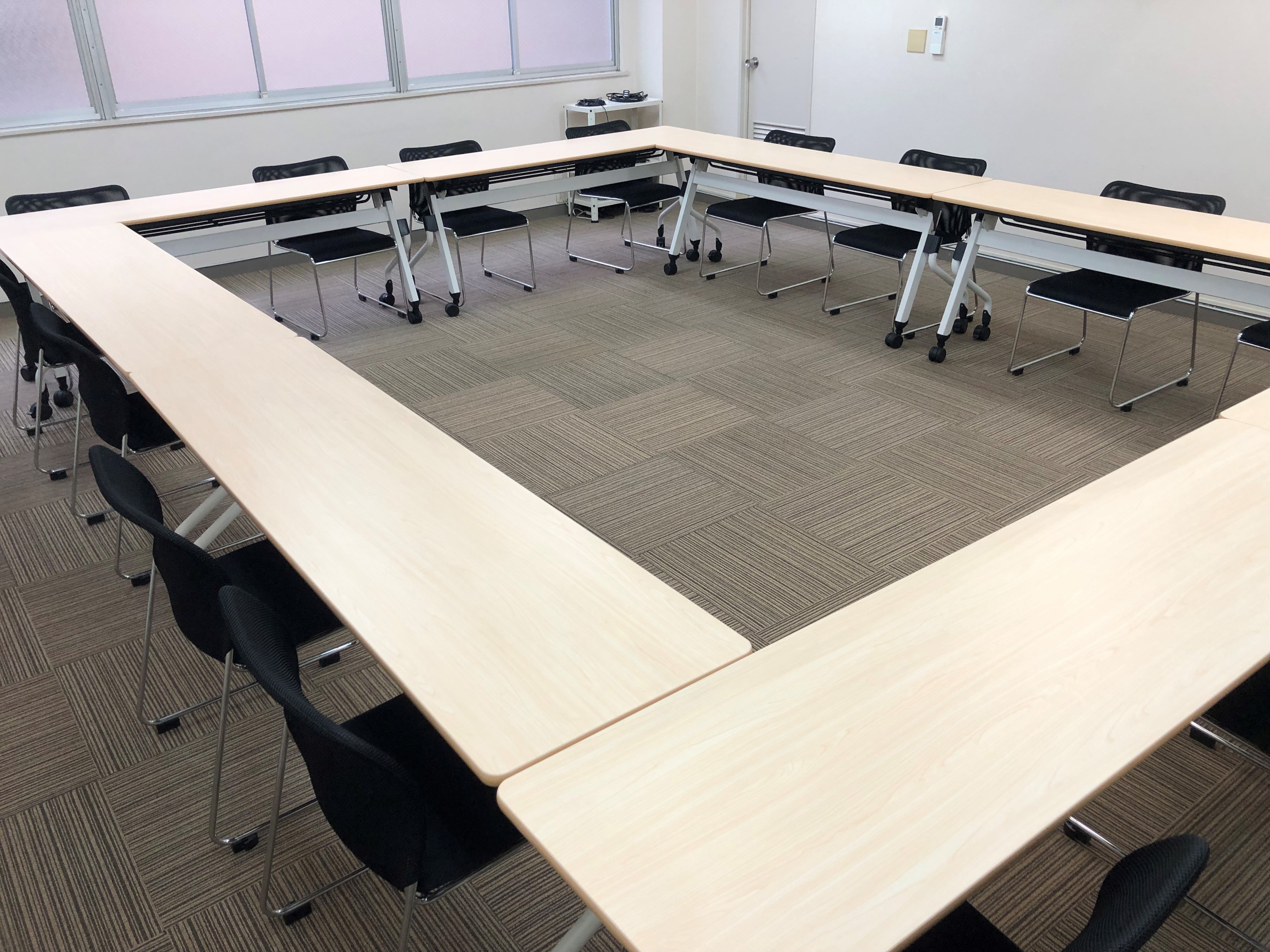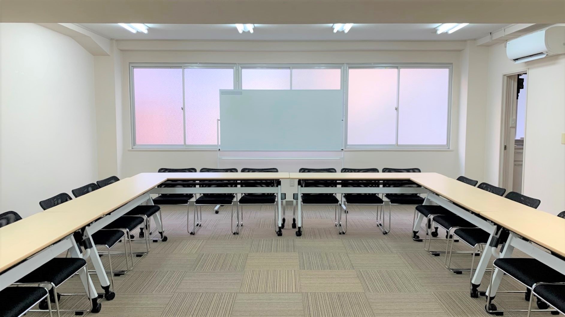 「虎ノ門駅」「内幸町駅」から徒歩すぐ。外堀通りの裏通り沿い、1階のお弁当屋さんが目印のビルにある貸しスペースです。新橋駅からも徒歩圏内とわかりやすい場所で、お部屋に窓があり、換気性も抜群です。机・椅子は 24名分 ロの字型でご用意しております。