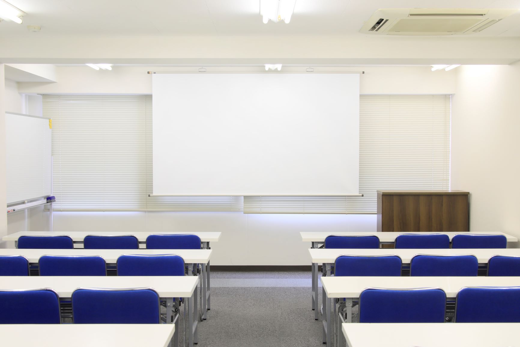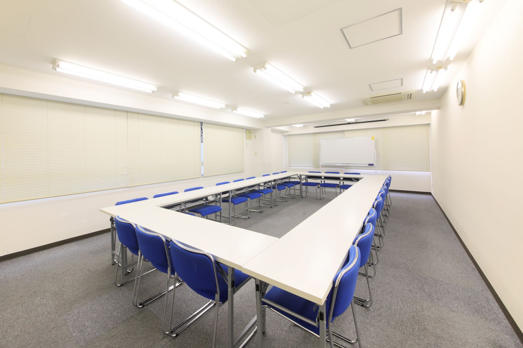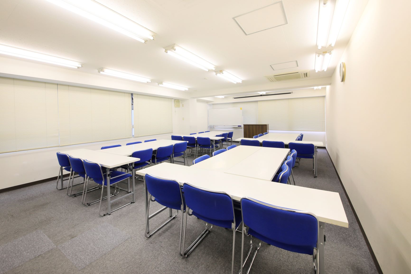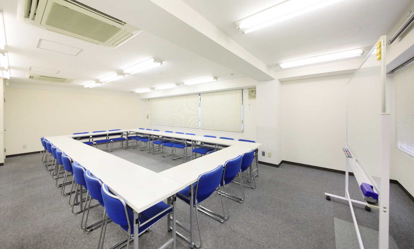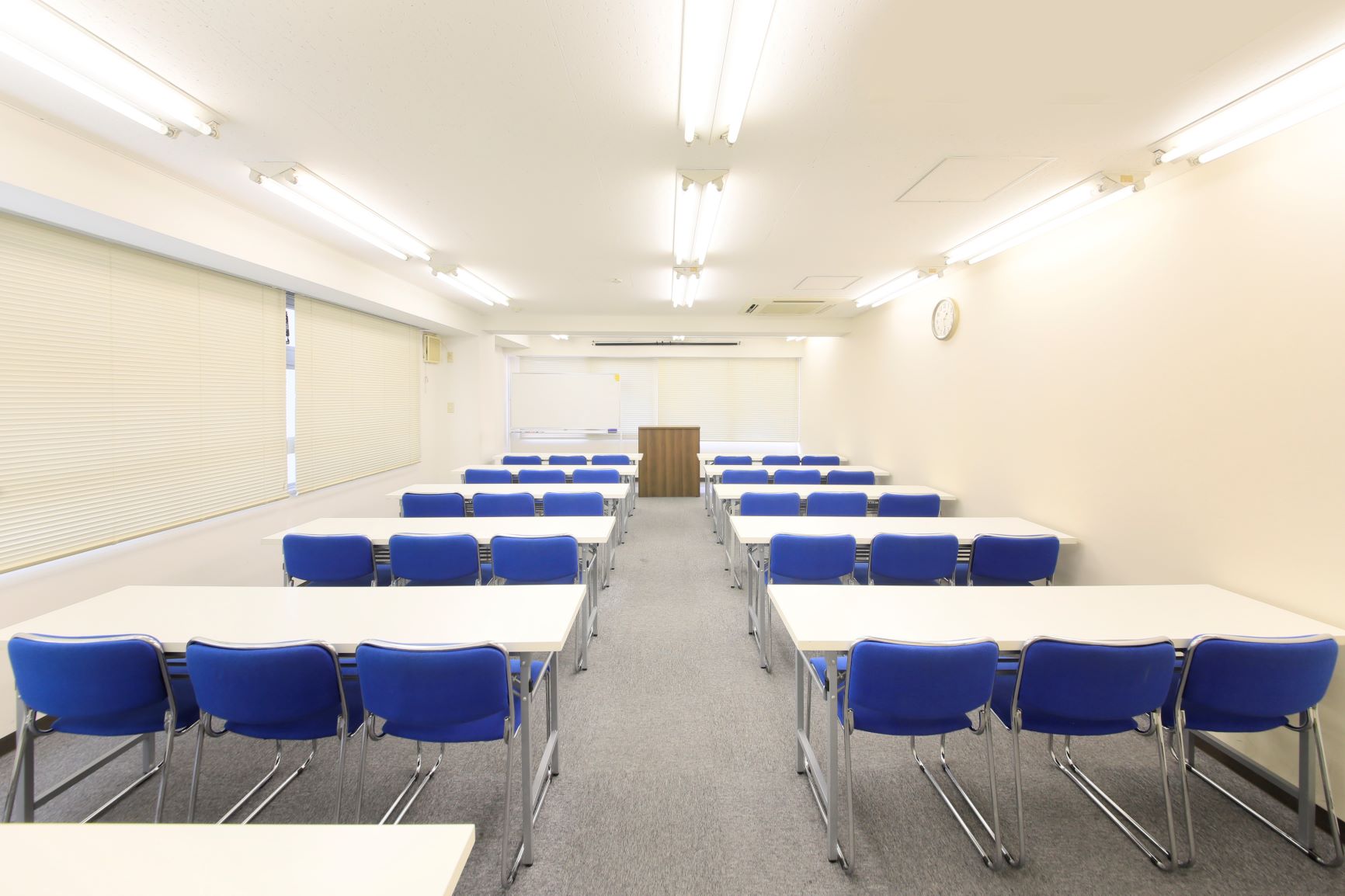 33名 スクール形式が標準レイアウトのお部屋となります。正面と左横側が窓の為、換気もできる明るいお部屋です。ハイブリット、会議、面接、セミナー、勉強会、研修、撮影、個人レッスンなど幅広い用途でお貸出し可能です。無料Wi-Fi6対応、専有型高速光回線も別途有料でご相談可能です。