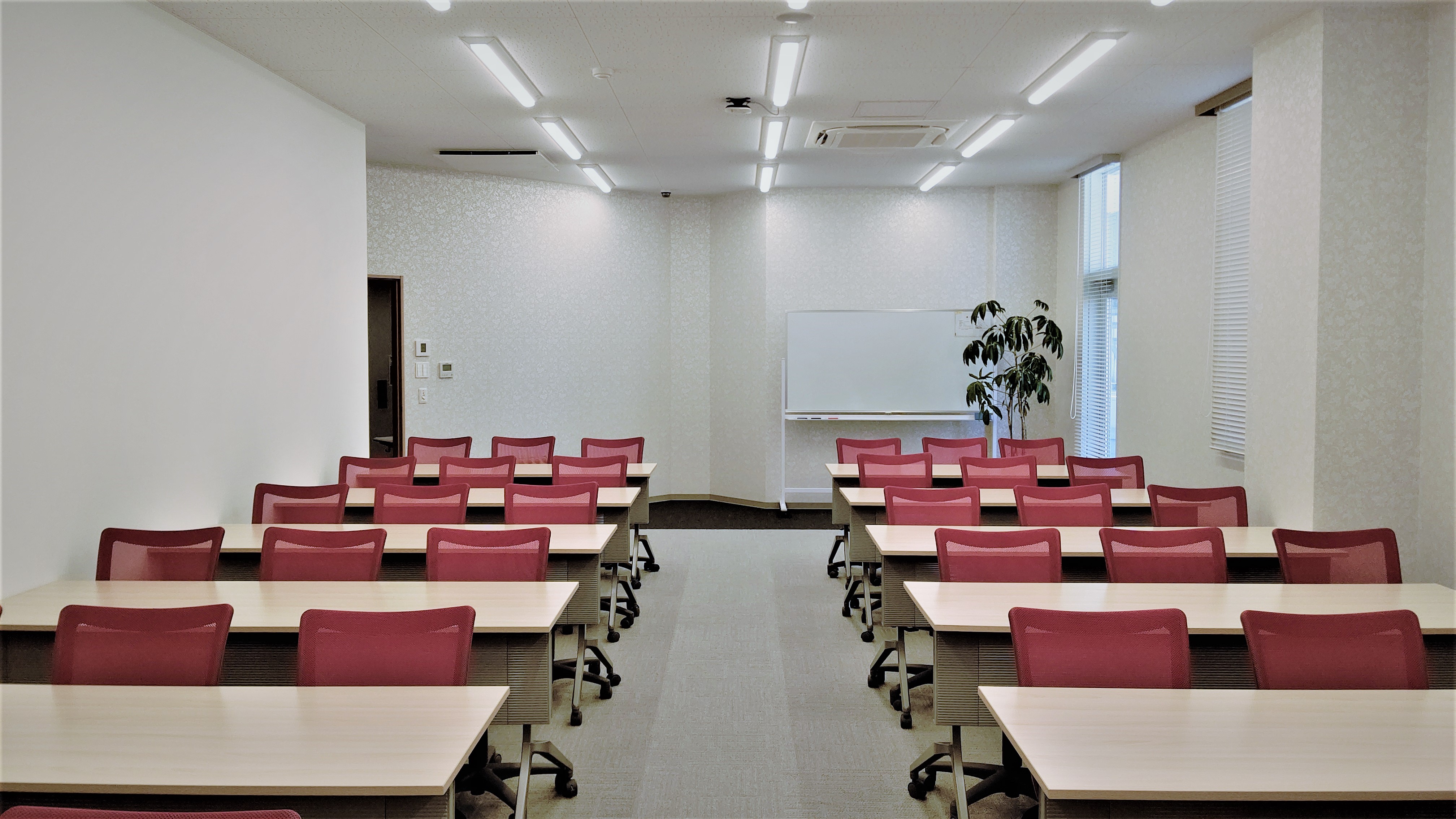 36名 (3名掛) スクール形式が標準レイアウトのお部屋となります。セミナー、勉強会、研修、講習会、会議ほか、毎年研修での長期利用実績多数あり、幅広い用途でお貸出し可能です。