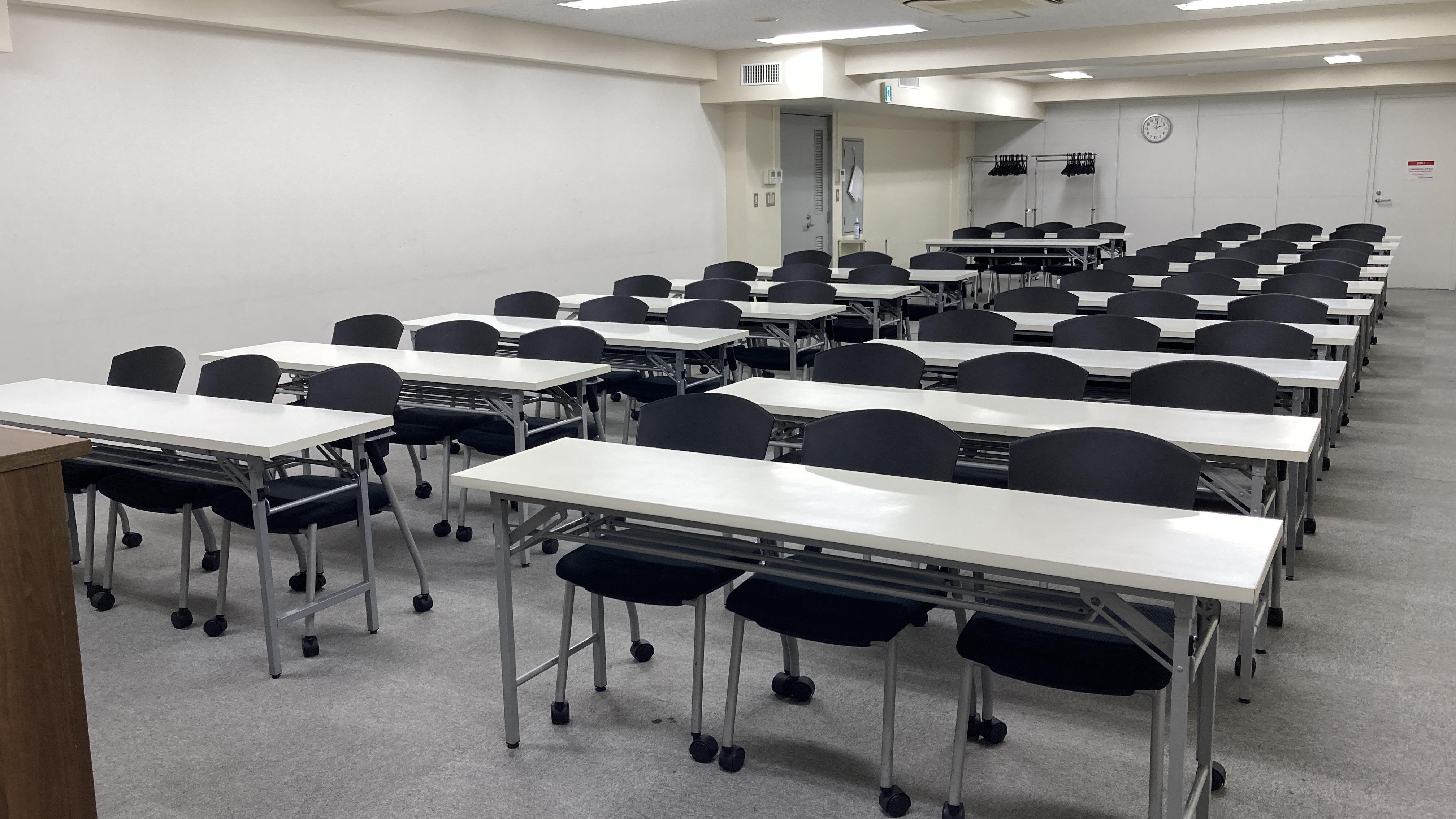 54名 98m² スクール形式が標準レイアウトのお部屋となります。駅近な好立地な場所にあり、セミナー、社内会議、研修、イベントスペース、販売会、試験、サテライトオフィス、近隣でのイベント控室など、様々な利用目的としてご利用が可能です。長期利用の実績も多数あり、お気軽にご相談ください。