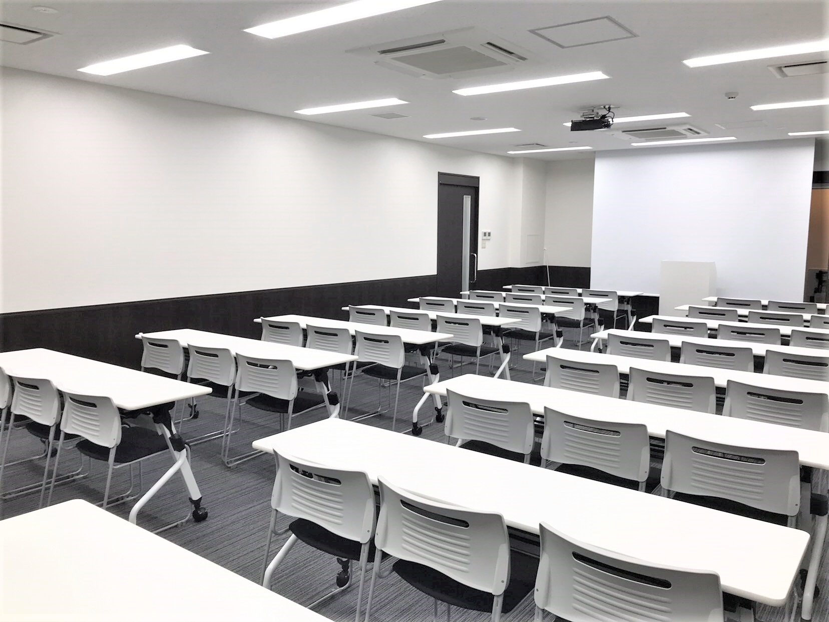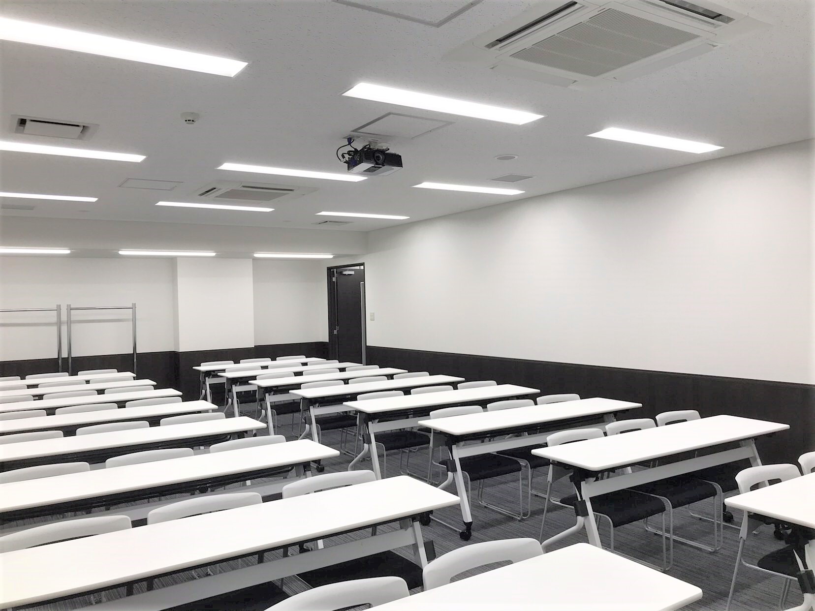 48名 71.40㎡ スクール形式が標準レイアウトのお部屋となります。社内会議、オンライン配信、ハイブリット、面接、セミナー、勉強会、研修、撮影、サテライトオフィス、長期利用など幅広い用途でお貸出し可能です。懇親会でのご利用も可能です。