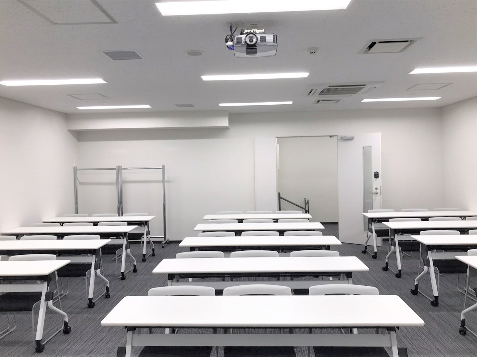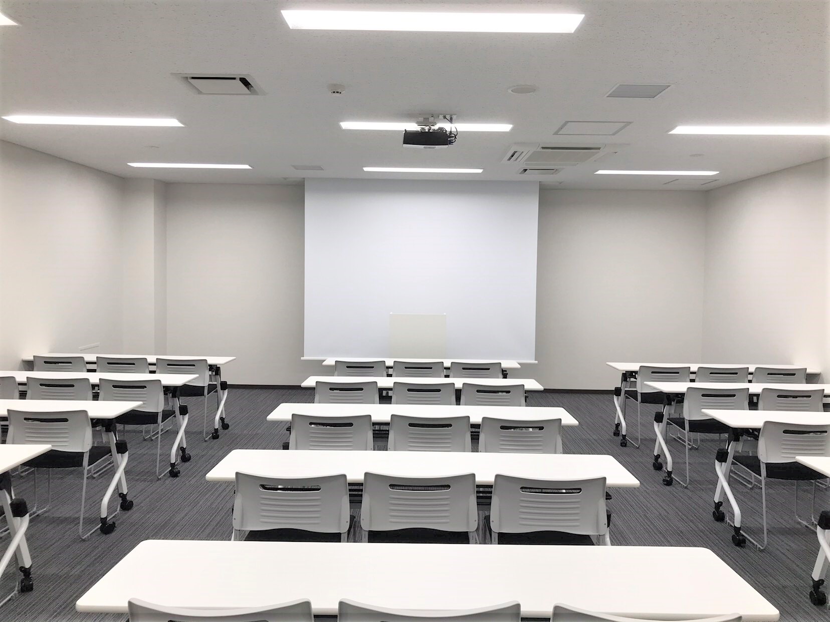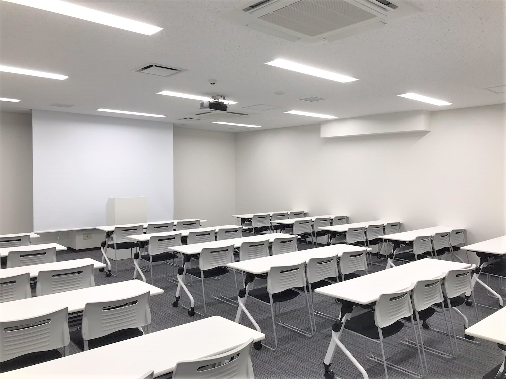 54名 69.50㎡ スクール形式が標準レイアウトのお部屋となります。社内会議、オンライン配信、ハイブリット、会議、面接、セミナー、勉強会、研修、撮影、サテライトオフィス、長期利用など幅広い用途でお貸出し可能です。ビル1階にはコンビニがあり便利です。