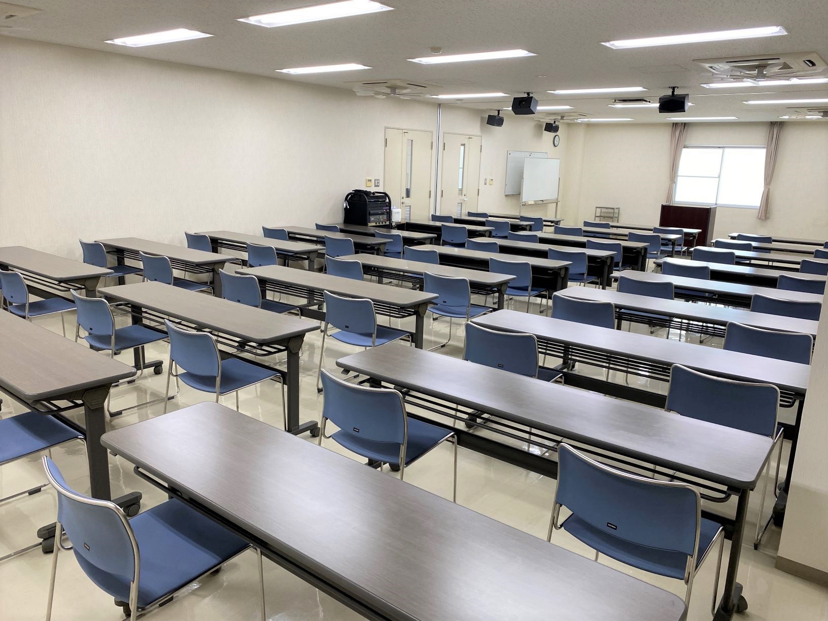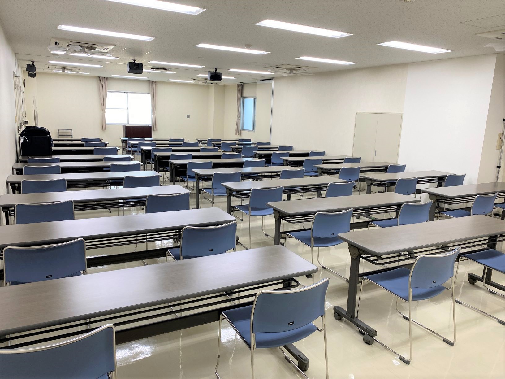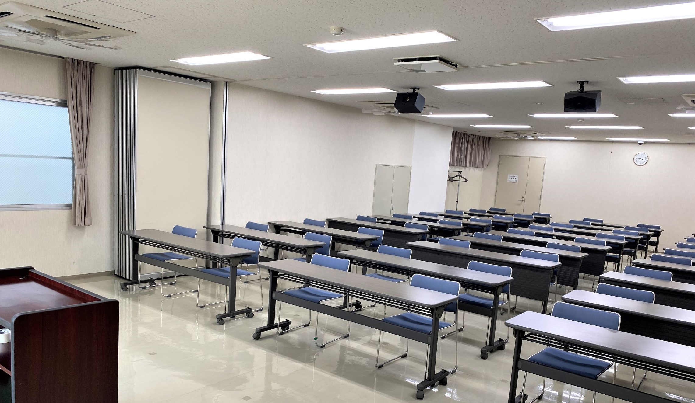 小研修室と中研修室の2部屋を稼働パーテーションを外した広さが105㎡ 78名定員、デフォルトは、各お部屋のスクール形式のままとなります。会員以外での一般利用もOK、セミナー、検定・講習会・研修・面接・社内会議・試験などご活用ください。マイクやプロジェクターは無料 (要事前予約)でご利用いただけます。